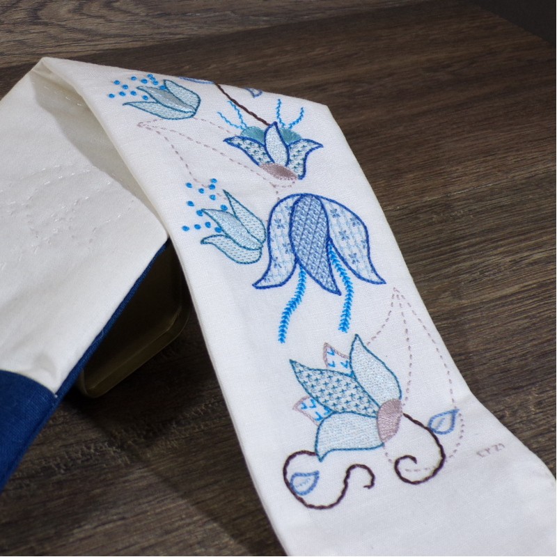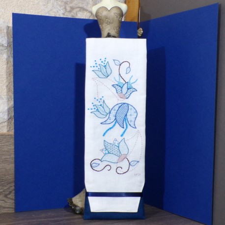Le motif fait apparaître des fleurs contemporaines travaillées avec des points traditionnels comme le point de feston en roue, le point de câble, le point de nœud.