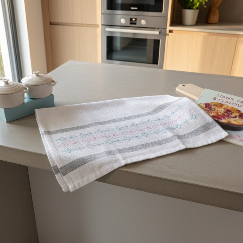 Alors pour les retenir, quoi de plus sympathique qu’un joli torchon. Et quoi de mieux que des arabesques brodées main pour inciter
