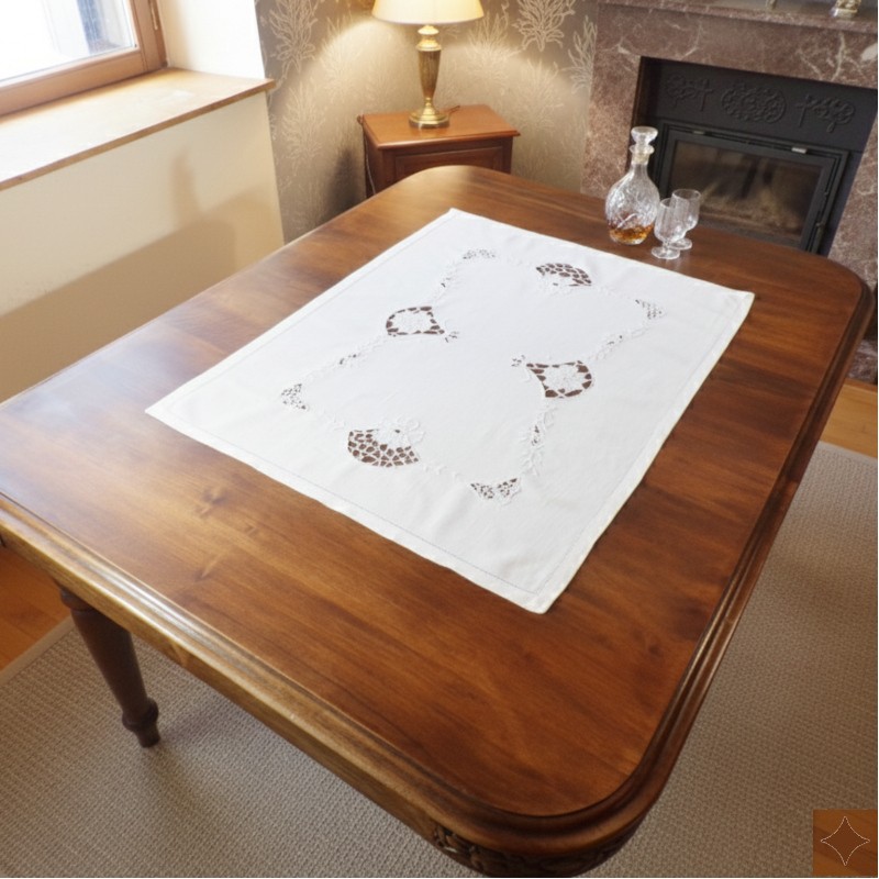 Des papillons ajourés forment les angles du motif central dans lequel on reconnaitra les paniers à fleurs très fréquent dans le linge de maison
