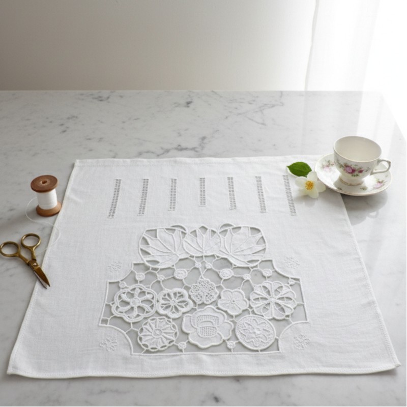 Entièrement brodé à la main, le travail est réalisé sur lin blanc en ton sur ton.
