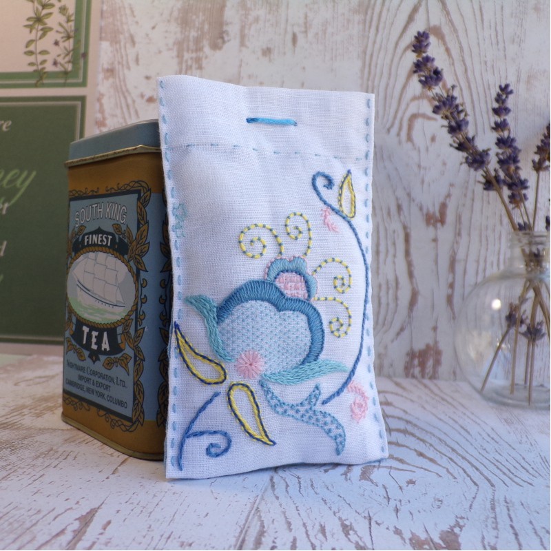 La pochette présente une broderie réalisée avec des points traditionnels comme le point de nœud, le point de câble, de Pékin, le point de feston.