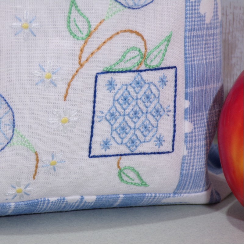 Sur le sac extérieur est posée une délicate broderie faite main avec des points traditionnels : le point de Holbein, le point de câble, le point de bouclette.